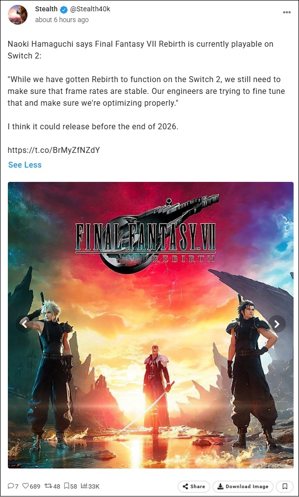 Le réalisateur souligne également que c'est un défi que l'équipe doit relever pour le portage de Rebirth sur Switch 2, même s'il confirme que le studio est parvenu à faire tourner la suite correctement sur la console. « Bien que [Rebirth] fonctionne sur Switch 2, nous devons encore nous assurer de la stabilité de la fréquence d'images. Nos ingénieurs travaillent à l'optimiser au maximum », déclare Hamaguchi.