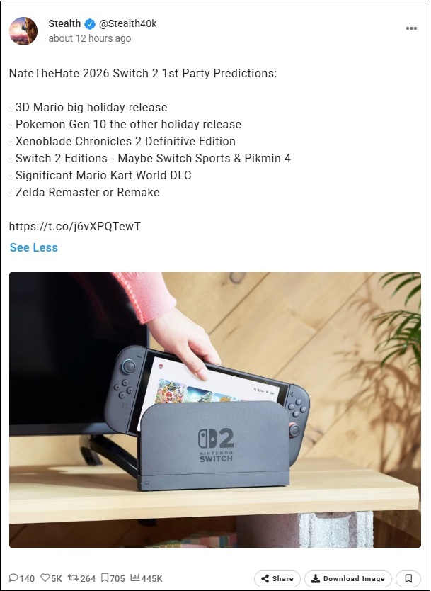 Toujours selon NateTheHate pour 2026, voici des possibles annonces concernant les jeux Nintendo sur Switch 2 :