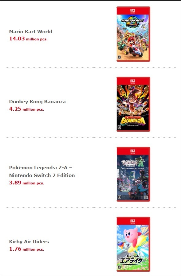 Nintendo vient de dévoiler ces derniers chiffres pour les consoles, avec une Switch 1 qui a dépassé les 155.3 millions, se placant devant les 155 millions de Ps2, mais derrière les 160 millions annoncés l'année dernière par Sony. Niveau jeux, voici ce que ça donne :