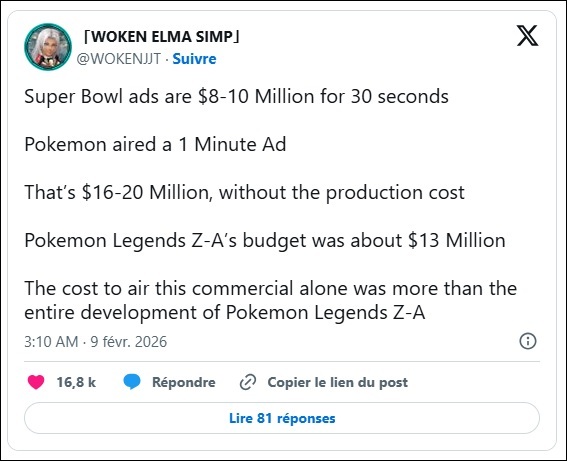 Le budget de Pokémon Legends Z-A était d'environ 13 millions de dollars.Le coût de diffusion de cette seule publicité a dépassé le coût total du développement de Pokémon Legends Z-A.