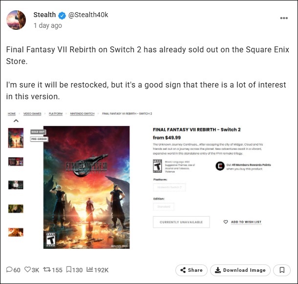 Final Fantasy VII Rebirth sur Switch 2 est déjà en rupture de stock sur la boutique Square Enix.