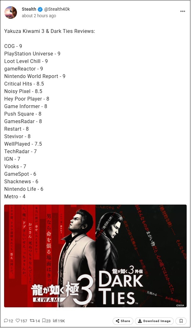 J'avais fait Yakuza 3 sur PS3 et jamais de la vie il merite 4, alors certes c'est un remake ici mais le jeu ne change pas tant que ca. C'est pas le meilleur opus de la serie mais de la à mettre 4...