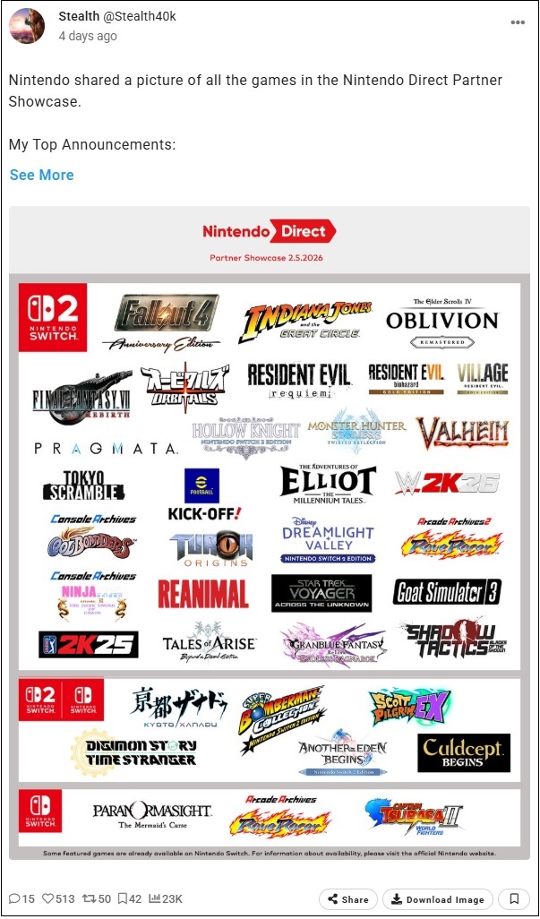 Nintendo a partagé une image de tous les jeux présentés lors du Nintendo Direct Partner Showcase.