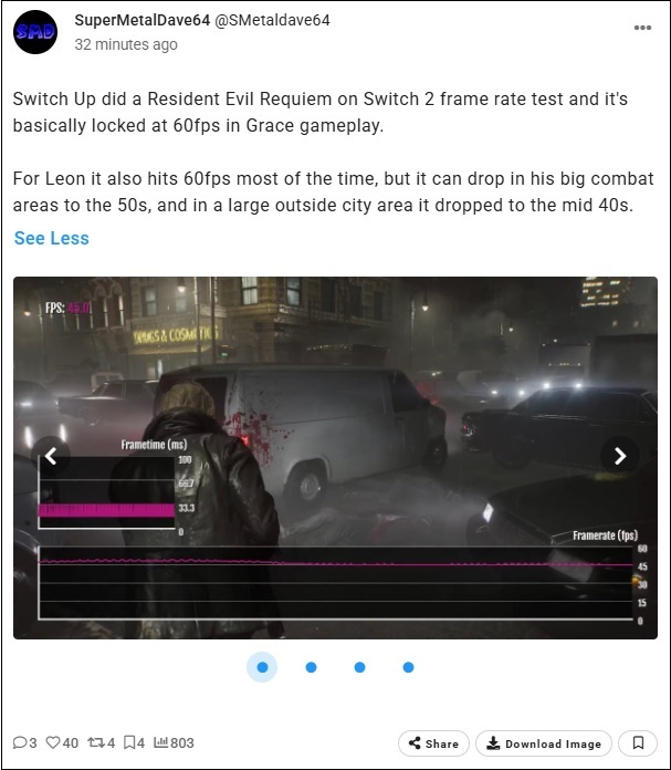 Switch Up a effectué un test de fréquence d'images sur Resident Evil Requiem (Switch 2) et le jeu se maintient à 60 images par seconde avec Grace. Avec Leon, le jeu affiche également 60 images par seconde la plupart du temps, mais la fréquence peut chuter à 50 images par seconde dans les zones de combat les plus étendues, et même à une quarantaine d'images par seconde dans les grandes zones extérieures à la ville.