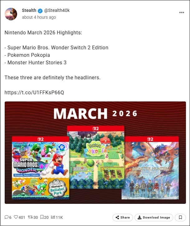 "En mars, créez un paradis Pokémon, découvrez une nouvelle région du Royaume des Fleurs, envolez-vous sur le dos d'un Rathalos et bien plus encore ! Découvrez la sélection de jeux disponibles en mars et n'hésitez pas à les précommander, les acheter ou les ajouter à votre liste de souhaits" :