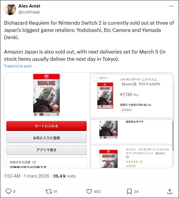 Il semblerait que les joueurs japonais se soient rués sur Resident Evil Requiem, récemment sorti sur Nintendo Switch 2. Selon certaines rumeurs, le dernier opus serait déjà en rupture de stock chez trois des plus grands distributeurs du Japon : Yodobashi, Bic Camera et Yamada Denki.