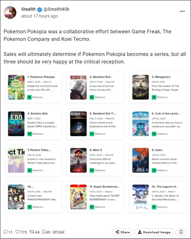 Pokémon Pokopia est le fruit d'une collaboration entre Game Freak, The Pokémon Company et Koei Tecmo. Les ventes détermineront en fin de compte si Pokémon Pokopia deviendra une série, mais les trois studios peuvent se réjouir de l'accueil critique.