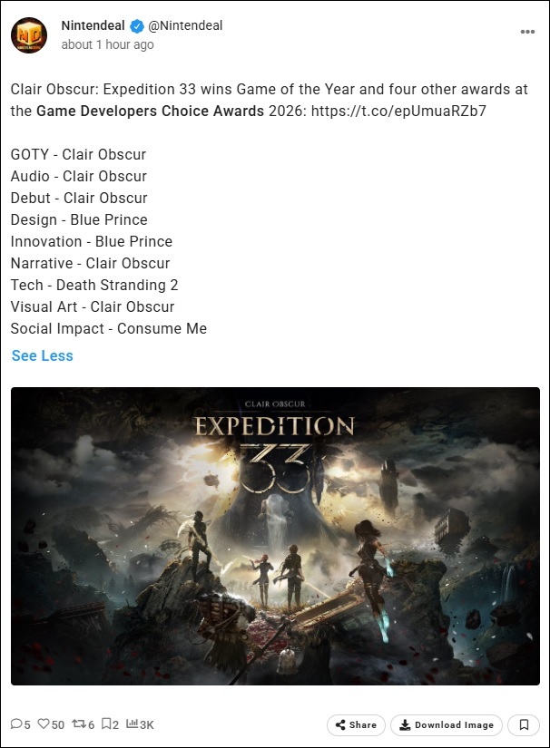 Clair Obscur: Expedition 33, développé par Sandfall Interactive et édité par Kepler Interactive, a été élu Jeu de l'année lors de la 26e édition des Game Developers Choice Awards (GDCA). Ce RPG de dark fantasy a raflé cinq prix, dont ceux du Meilleur Premier Jeu, des Meilleurs Graphismes, du Meilleur Scénario et de la Meilleure Écoute. Organisés chaque année par le GDC Festival of Gaming, les GDCA sont les plus prestigieuses récompenses internationales du secteur du jeu vidéo, honorant les meilleurs jeux de l'année écoulée et leurs créateurs.