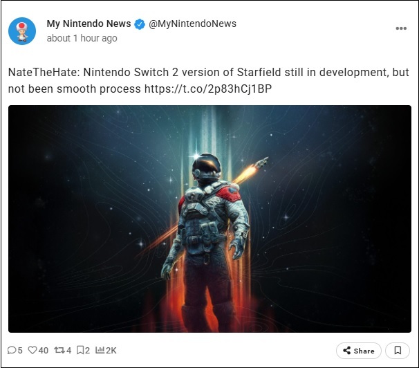 Le célèbre leaker de jeux vidéo NateTheHate a commenté la version Nintendo Switch 2 non annoncée de Starfield, qui ne figurait pas parmi les jeux dévoilés par Bethesda lors du Partner Direct. Selon Nate, le développement du jeu sur cette plateforme est toujours en cours, mais est semé d'embûches. Il conseille donc aux joueurs de croiser les doigts et d'espérer que le projet aboutisse.