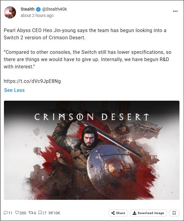Lors d'une assemblée générale des actionnaires, Heo Jin-young, PDG de Crimson Desert, a évoqué la possibilité de porter le jeu sur la console de Nintendo. Il a souligné que l'équipe devrait composer avec des spécifications techniques inférieures, mais que Pearl Abyss avait « entamé des travaux de recherche et développement avec intérêt ».Voici la déclaration complète :