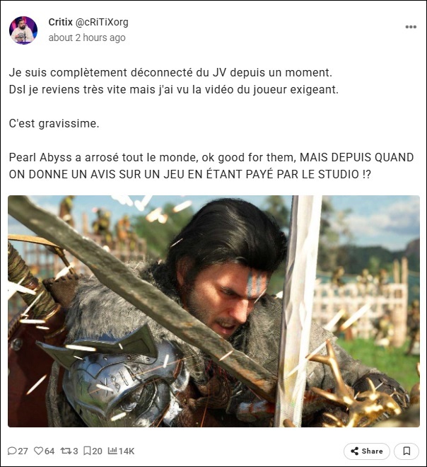 Joueur Exigeant (https://www.youtube.com/watch?v=Hs51z7x7cAE) qui se base sur quelques créateurs français, dont Carole Quintaine, qui ont effectivement une collaboration commerciale avec Pearl Abyss sur plusieurs vidéos de Crimson Desert mais de là à dire "Pearl Abyss a arrosé tout le monde" mouais bon faut doser