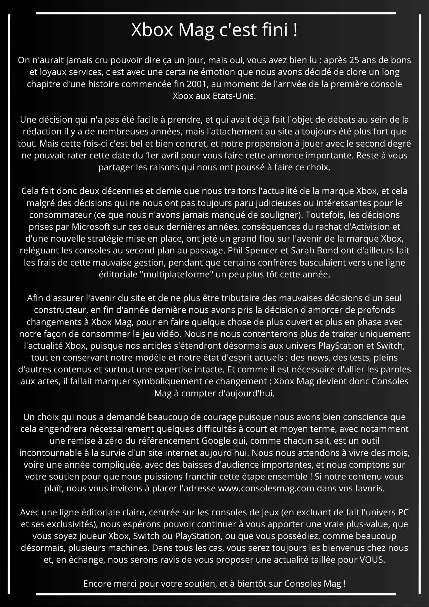 comme XboxEra ,c'est Xbox MAG qui apres 25 ans change pour "Consoles MAG" (a priori pas un poisson d'avril)