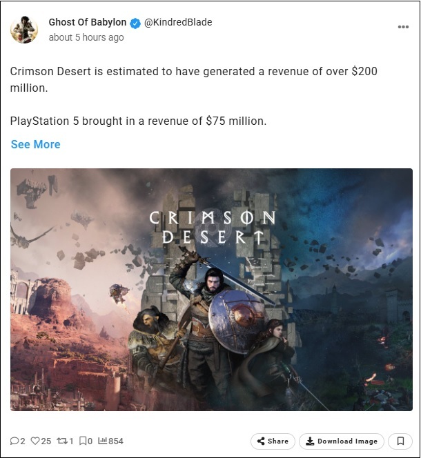 Rhys Elliott, responsable de l'analyse de marché chez Alinea Analytics, a déclaré dans un article publié sur Substack que le jeu d'action-aventure en monde ouvert Pearl Abyss a généré 200 millions de dollars de recettes sur toutes les plateformes (PC, PlayStation 5, Xbox Series X et S) à ce jour. De façon assez surprenante, Elliott estime que 75 millions de dollars proviennent de la seule PS5. Le constat général est que cet immense succès commercial prouve « l'appétit considérable pour les jeux en monde ouvert solo de haute qualité ».