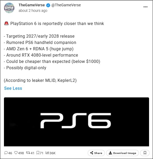 Ces dernières semaines, des rumeurs circulaient selon lesquelles la sortie de la PlayStation 6 pourrait être repoussée bien au-delà de la fenêtre de lancement fin 2027/début 2028 en raison du contexte économique actuel difficile. Cependant, de nombreuses fuites provenant de Moore's Law is Dead indiquent que la console est imminente, Sony travaillant activement sur une transition générationnelle rapide. D'après certaines sources, le développement du mode économie d'énergie progresse de manière à prouver, « sans l'ombre d'un doute, destiné à assurer la compatibilité avec la PlayStation 6 en mode portable », selon l'informateur.