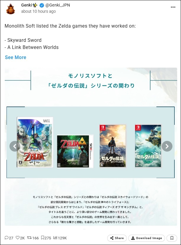"À l'avenir, en tant que membre de l'équipe qui crée l'univers de « The Legend of Zelda » avec Nintendo, nous (Monolith Soft) continuerons à développer des jeux offrant toujours plus de surprises et d'émotions."