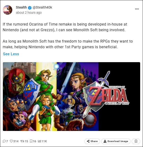 Le timing est assez curieux. Le studio précise qu'ils aimeraient avec un rôle encore plus important dans la création des Zelda. Si le remake d'Ocarina of Time, dont on parle beaucoup, est développé en interne chez Nintendo (et non chez Grezzo), il est probable que Monolith Soft y participe.