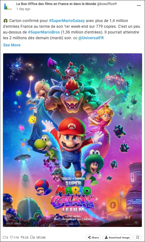 Au terme de son premier week-end, le film a généré 1.4 millions d'entrée. C'est un peu mieux que le préécédant, Super Mario Bros Le film qui avait réalisé 1,36 million d'entrées sur le même laps de temps.
