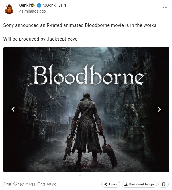 "Salut les gars, je suis Jacksepticeye et comme annoncé à CinemaCon, Sony Pictures réalise officiellement un long-métrage d'animation Bloodborne. Je produis ce projet et vous n'avez pas idée à quel point je suis incroyablement excité de pouvoir enfin en parler !! Je vais faire tout ce qui est en mon pouvoir pour que ce soit la MEILLEURE adaptation de Bloodborne possible. Ce n'est pas seulement mon jeu préféré de tous les temps, mais je sais à quel point les fans de ce jeu sont vraiment passionnés et combien ils ont envie d'en voir plus. Je ne peux pas partager beaucoup d'informations sur le projet pour le moment, mais ça fait tellement de bien de vous faire savoir que ça se passe !"