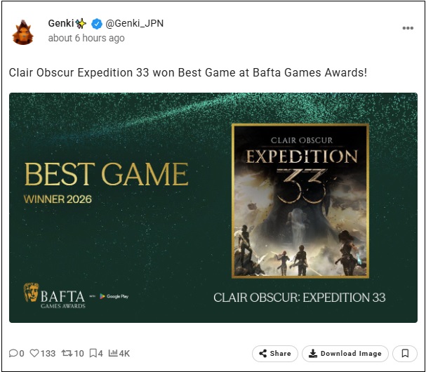 Les BAFTA Games Awards ont eu lieu ce soir et un jeu s'est clairement démarqué : Clair Obscur: Expedition 33, encensé par la critique et récompensé dans de nombreuses catégories, dont celle du Meilleur Jeu. Par ailleurs, Blue Prince, disponible sur Nintendo Switch 2, a reçu le prix du Meilleur Game Design, No Man’s Sky celui du Meilleur Jeu Évolutif et South of Midnight celui de la Meilleure Nouvelle Licence. Voici la liste complète des lauréats des BAFTA Games Awards :
