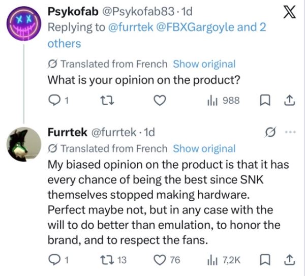 "Mon opinion un peu partiale à propos du produit est qu'il risque d'être le meilleur qui soit depuis que SNK ait arrêté de produire des consoles. Peut-être ne sera t-elle pas parfaite, mais avec la volonté de faire mieux qu'un simple émulateur, afin d'honorer la marque et par respect pour les fans."