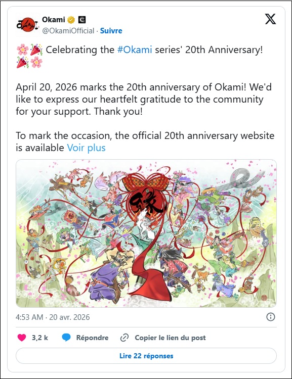 "Le 20 avril 2026 marquera le 20e anniversaire d'Okami ! Nous tenons à exprimer notre profonde gratitude à la communauté pour son soutien. Merci ! Pour célébrer cet événement, le site web officiel du 20e anniversaire est disponible. "
