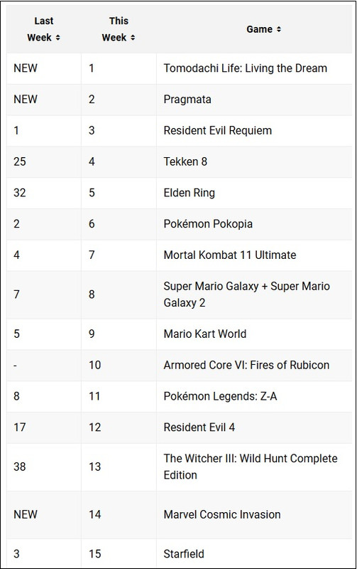 Ces nouveaux venus font chuter Resident Evil Requiem à la troisième place, tandis que Pokémon Pokopia dégringole à la sixième. Au moins, Marvel Cosmic Invasion a attiré quelques fans depuis la sortie de son édition physique la semaine dernière !