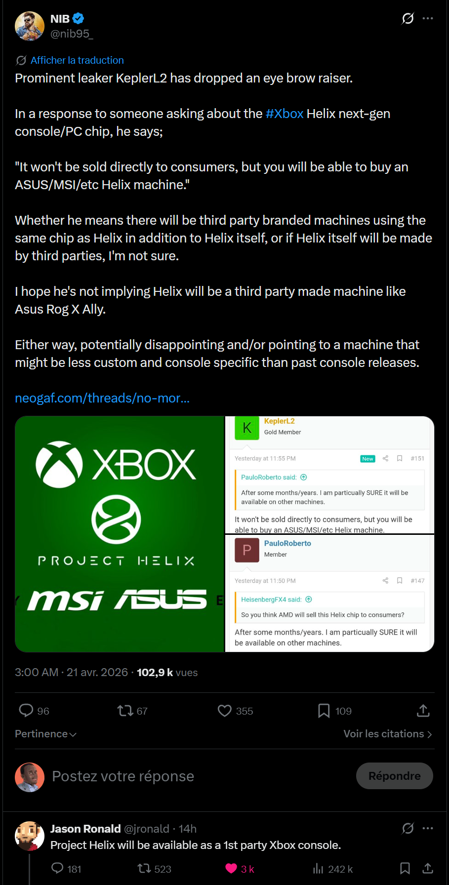 Ensuite il y avait des "rumeurs" pour ne pas dire des fakes news de kepler sur le fait que le projet helix serait pas fait par xbox mais par des oem comme asus et msi et cela a été propagé par un influenceur pro sony, et Jason Ronald (vice président en charge de la next gen) le concepteur en chef de la series x et aussi de la future Helix, est venu lui répondre que le projet Helix est bel et bien une console first party xbox et conçue par xbox, il a ratio le gars au passage, ce dernier veut quand même essayer de discuter, mdr.