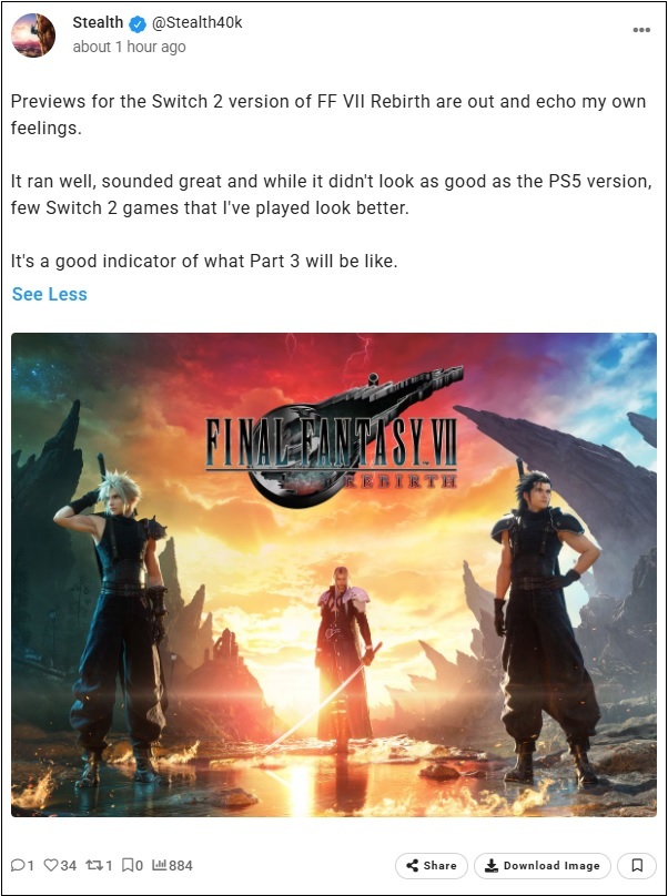 Les aperçus de la version Switch de FF VII Rebirth sont disponibles. Le jeu est fluide, le son est excellent et, même s'il n'est pas aussi beau que la version PS5, rares sont les jeux Switch 2 qui offrent un meilleur rendu visuel. C'est un bon indicateur de ce que donnera le troisième opus. Voici celui de NintendoLife :
