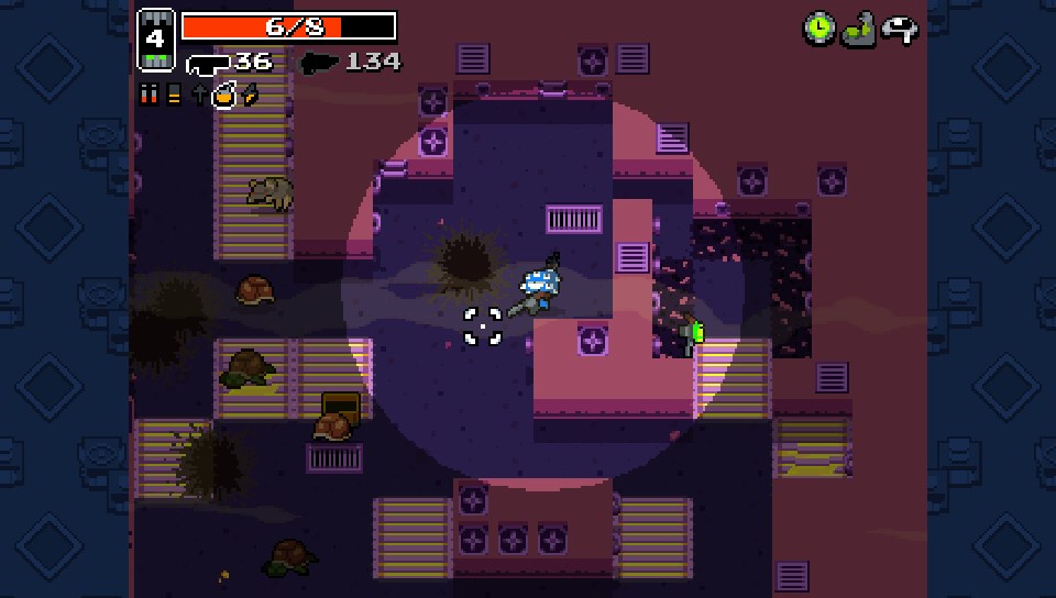 gameplay. Chacun peut être boosté via la mutation appropriée (Crystal pourra se téléporter, Fish rouler indéfiniment...). Je vous avouerais que j'ai plutôt squatté Crystal, son coup spécial étant plus qu'utile pour faire face aux déferlements de boulettes ennemies qui ne manqueront pas d'arriver tôt ou tard. Et si vous ne vous trouvez pas dans un endroit susceptible de vous cacher aux tirs ennemis, à moins d'avoir choisi une évolution les ralentissant, ça risque de vite poser problème si vous n'êtes pas un virtuose du clavier ou de la manette. Sans compter que les ennemis montent en puissance et que certains n'hésiteront pas à défoncer les murs pour aller vous chercher, que ça
