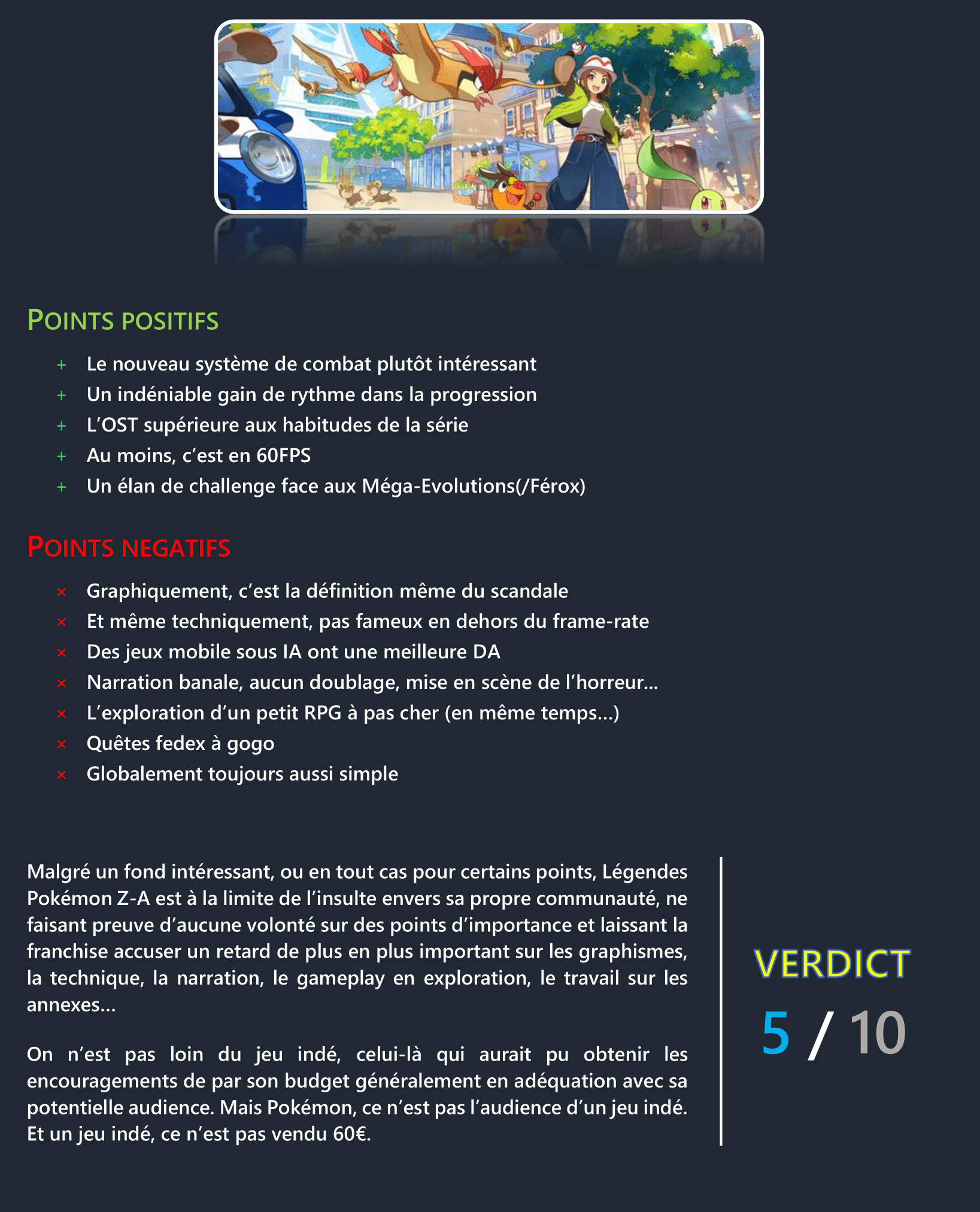 Alors en point positif : l'OST supérieure aux habitudes de la série ... non Arceus était largement mieux, d'ailleurs sur Arceus je jouais avec le son alors que Z-A j'ai mute au bout de 2-4h horrible.