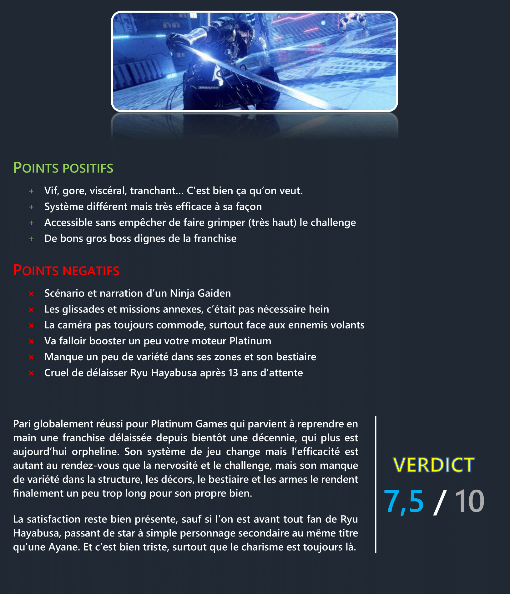 Concernant ce Ninja Gaiden, je suis au second chapitre et pour l'instant je n'ai rien à dire à part qu'il est excellent. je suis un grand fan de Ninja gaiden 1 et 2 sur Xbox originaux( je deteste les sigma, je n'ai pas aimé black 2, jamais fait le 3 ou RE) et cette suite pour l'instant marque un gros point sur le gameplay frais , nerveux et qui prend des risques.