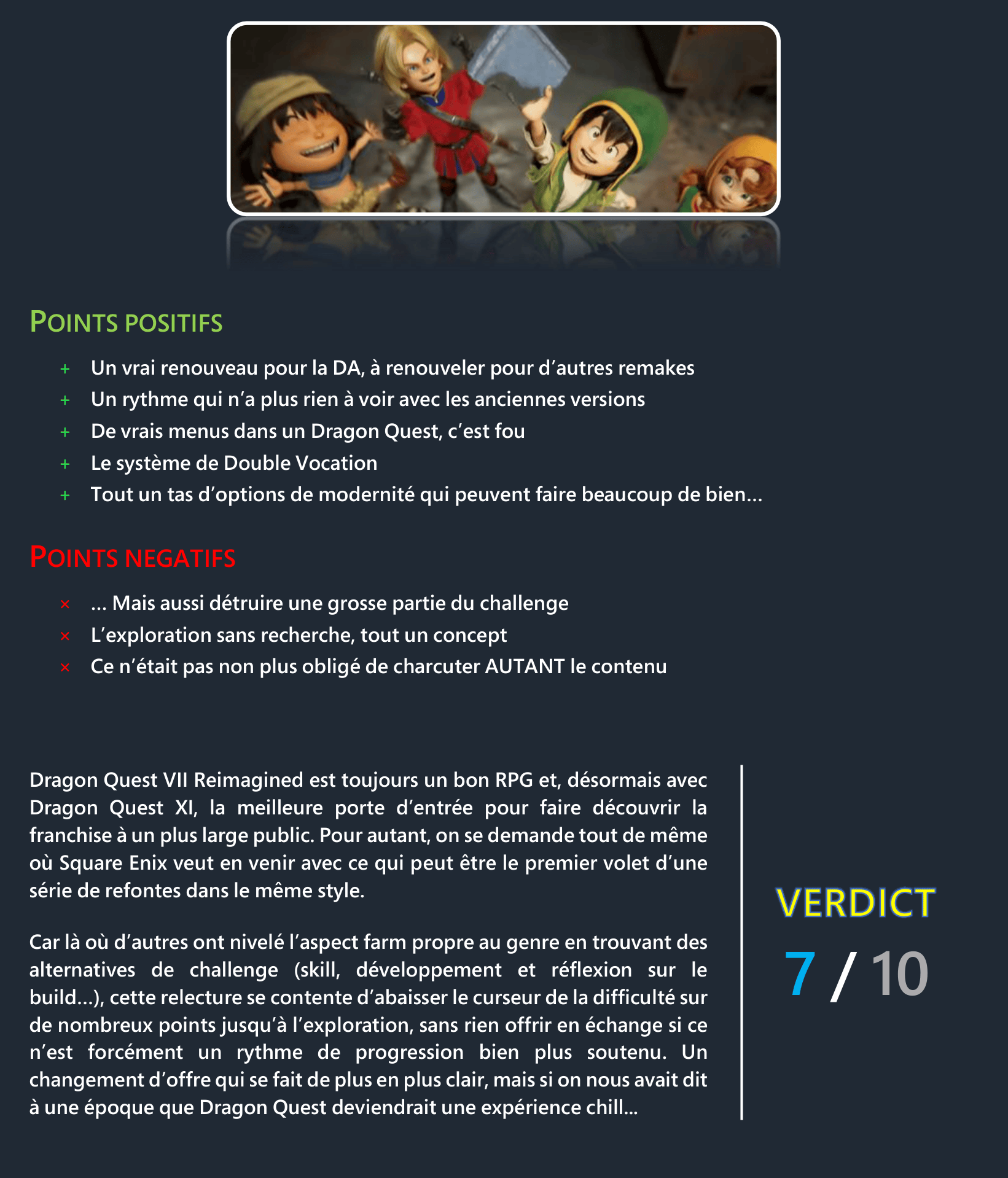 Dragon Quest VII d’origine n’était pas lié au skill mais à la limitation de la puissance des héros face aux opposants, chose que l’on contourne avec la bonne vieille technique du farm. La base du genre depuis 1986, mais en 2026, bien des joueurs n’ont plus envie de farmer tant il n’en ressort rien si ce n’est une durée de vie boosté artificiellement.