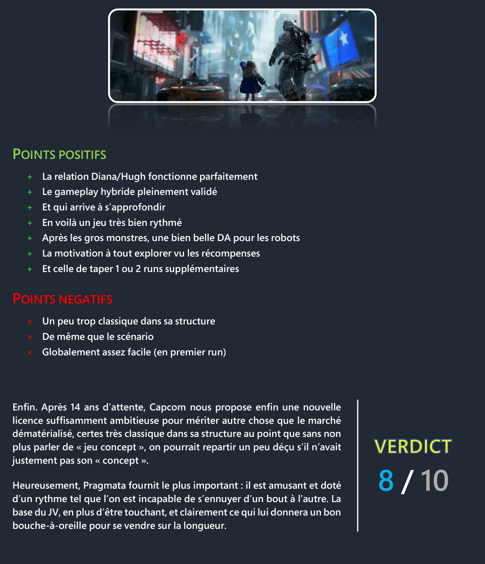 Je suis du genre mauvaise langue, aussi bien à cause de la sagesse que l’âge, donc Pragmata, je n’y croyais évidemment pas, et je ne parle pas de la qualité du jeu mais juste de son existence tant depuis son annonce il y a déjà 6 ans, Capcom semblait être reparti pour nous faire une Deep Down. Mais le miracle a eu lieu et l’éditeur est donc ENFIN parvenu à pondre une nouvelle licence AAA, quelque chose qui ne lui était pas arrivé depuis Dragon’s Dogma en 2012, car il faut le dire, Kunitsu-Gami et Exoprimal, c’était rigolo, mais c’est surtout un peu oublié et personne ne nous en voudra tant c’était destiné à être de simples tentatives sans trop y croire commercialement (ce fut d’ailleurs deux flops). Par contre pour Pragmata, on croise déjà les doigts pour un minimum de ventes tant les développeurs méritent que l’on s’attarde sur leur nouveau bébé.