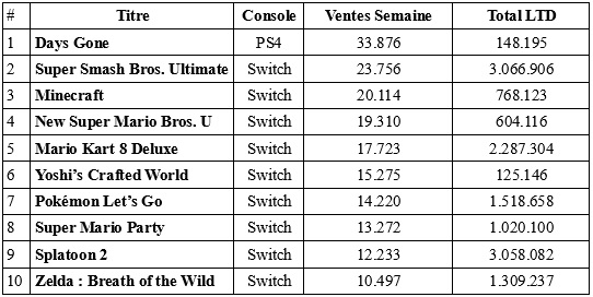 Days Gone de se maintenir au sommet pour une deuxième semaine, poursuivi par une tornade de jeux Switch qui montrent leurs ventes sur la longueur. On remarquera par exemple que