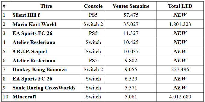 que la Switch 2 soit 1ère ok pas de problème c'est juste logique mais que la Switch 1 soit devant la PS5 c'est un peu dingue d'autant qu'on est sur une semaine où un Silent Hill f se place 1er du classement software.