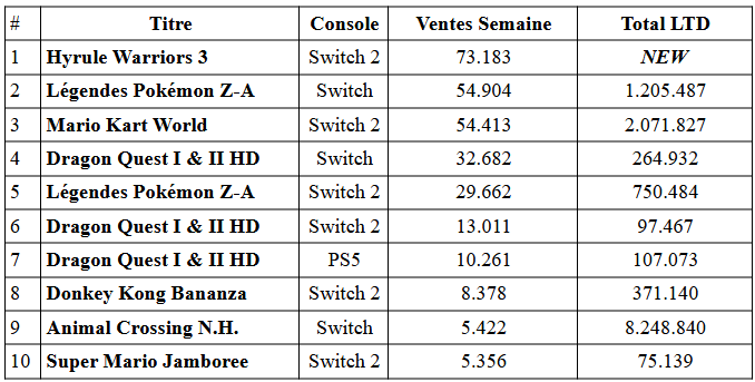 A noter qu'il y a que 4 jeux PS5 dans le top 30, tout le reste c'est Switch (17 jeux) et Switch 2 (9 jeux)