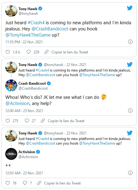 Crash Bandicoot 4 avec une arrivée prévue le 12 mars prochain sur PC, PlayStation 5, Xbox Series et enfin Nintendo Switch. Et dans un petit jeu façon teasing, tout cela rend bien jaloux Tony Hawk qui lui aussi est sorti sur un nombre limité de supports en septembre dernier (PC/PS4/One) et qui aimerait bien élargir sa base dans les temps à venir.