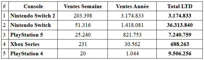 Petit tour du côté du Japon pour livrer le dernier rapport en date où ça sent bon les fêtes de fin d'année, par forcément pour la domination de Nintendo (ça c'est standard là-bas) mais bien pour le joli coup des 200.000 Switch 2 écoulées permettant à la machine de dépasser largement le cap des 3 millions. Ça progresse.